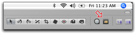 1. Click on the Keyword icon to open the keyword HUD. ("HUD" is Aperture-speak for "heads up display," which is basically a floating non-modal panel; there are several different HUDs in Aperture). This is located in the upper right hand corner of the basic Aperture window to the right of the Loupe icon. The red arrow below is pointing at the Keywords HUD icon, which looks like a little yellow tag.