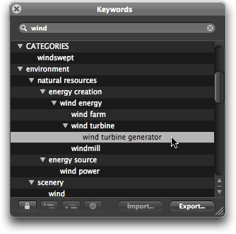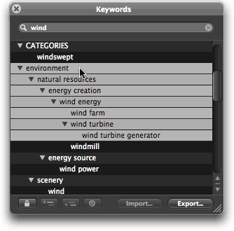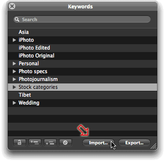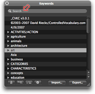 [please note] If you have a version of the Apple Aperture keyword list that you may wish to "reload" at a later point, do note that the instructions given below will append the CVKC to your existing data. If so, make sure you "save" your existing data first using the Export button in the Keyword dialog window.