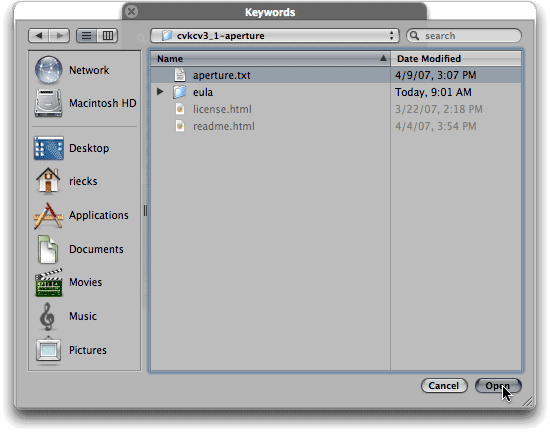 4. In the navigation dialog, open the folder, locate the keyword list (named "aperture.txt") and select it. Then click on the Open button.