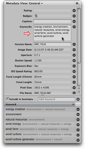 2. In the control bar just above the Keyword tabbed section in the Metadata