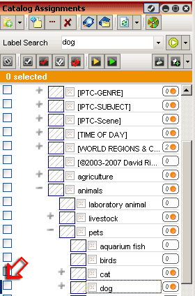 If you type a term into this field, you will see various paths that correspond to that term appear just below where you are typing. You can use your mouse, or arrow keys to select one of these paths. Once selected that path appears in the Label Search field. If you press the Enter key, or click on the white triangle inside the lime green circle to the left of the Label Search field, you'll find that you are taken to that part of the hierarchy. A vertical black bar will appear next to the term you have typed in (noted by red arrow below), ready for you to assign it as a Catalog Label / Keyword.