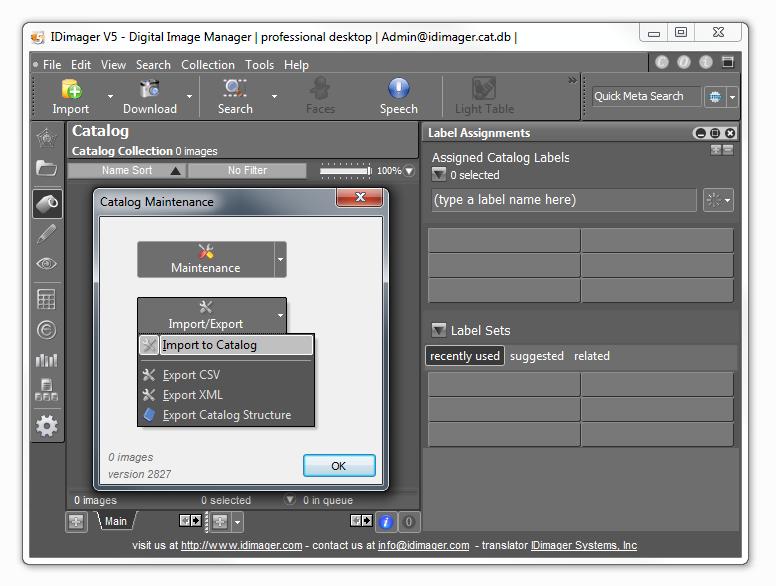 From the IDimager Catalog Maintenance dialogue, click on the white downward pointing arrow to the right of the Import/Export icon, and from the resulting pop-up menu choose Import to Catalog and click the OK button.