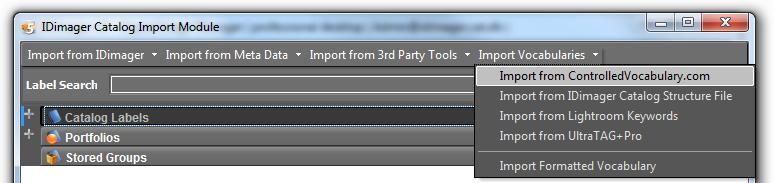 In the resulting IDimager Catalog Import Module choose Import Vocabularies, the last item to the right in the tab of sub menu items; and from the resulting pop-up menu choose Import from Controlled Vocabulary.com. This will open a folder within the IDimager program on your local hard drive as noted above.