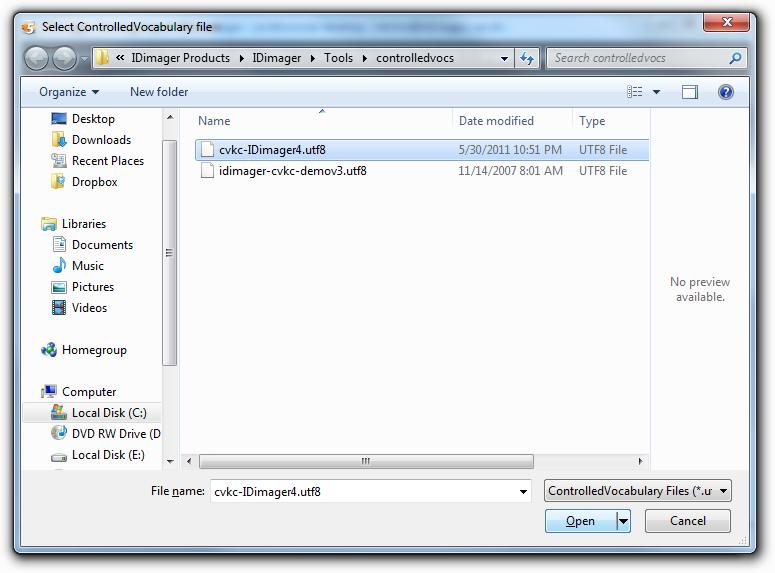 This action will open a file navigation dialog labeled Select ControlledVocabulary file. With version 5 (actually for v 4.2 or later) this will default to the…\IDimager Products\IDimager\Tools\controlledvocs folder. If you left the folder on the desktop, you will need to go to that level to locate the folder you downloaded. Important: please note that the "idimager-cvkc-demov3.utf8" is already in this location. Do not mistake this as being the file you need to import.