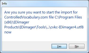 After choosing the file, you'll be presented with a confirmation dialogue, asking if you are sure that you want to start the import for the Controlled Vocabulary file . You should be greeted with a confirmation dialog asking, Are you sure you want to start the import for ControlledVocabulary.com file [path noted to the cvkc vocabulary file] now (check to be sure that the specific location of the file is the one you wanted to select).