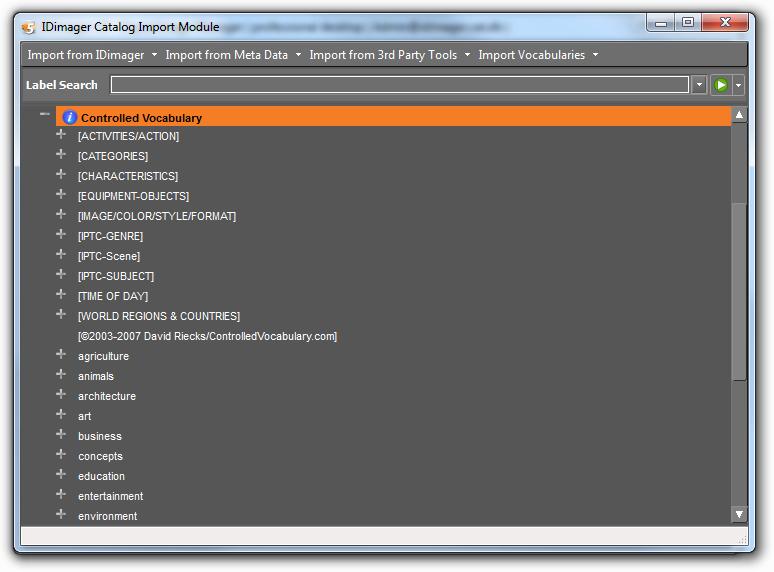 After the import has finished you should now see the ControlledVocabulary.com set of terms in the Catalog Labels section of the IDimager Catalog Import Module. If you expand the Catalog Labels In the IDimager Catalog Import Module (the blue items), you'll see a new item at the bottom labeled Controlled Vocabulary with a white lower case i in a blue circle. Clicking on that "info" button will take you to the CVKC product page for IDimager. Clicking on the Plus sign + will expand out the hierarchies available within the Controlled Vocabulary Keyword Catalog. Closing that dialogue will return you to the main IDimager window, with the Catalog Maintenance dialogue window still open. Click on the OK button to return to the main application.
