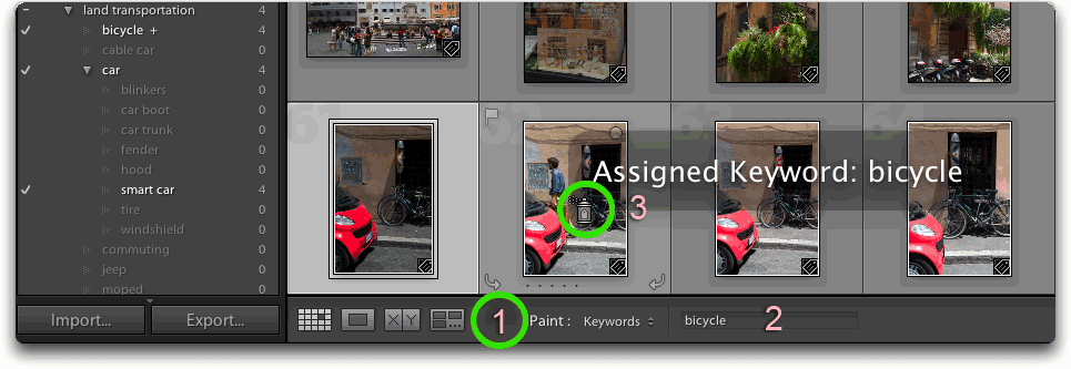 Once you’ve specified the keyword(s), you can quickly apply the keyword shortcut to photos by placing the Painter tool (as shown near number 3 above) over the image in question and clicking the mouse. On the first click, you'll see the note above, indicating that the keyword has been applied. If you click on the mouse a second time you will see that the keyword has been removed. When you are done assigning or removing keywords you need to disable the Painter tool. Simply click the circular well in the toolbar area indicated as 1 above.