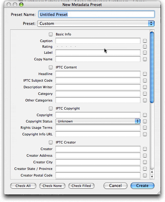 To apply a new set of metadata to photos while importing choose New and enter the information in the New Metadata Preset dialog box.