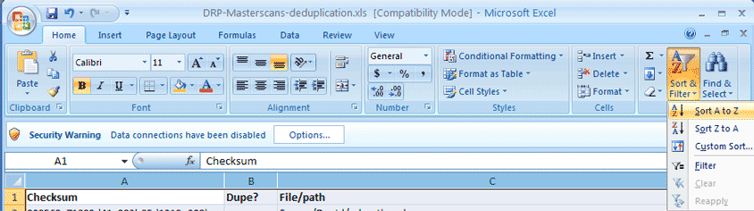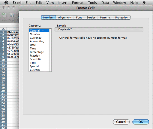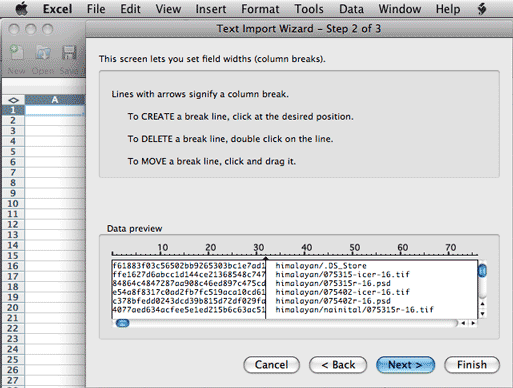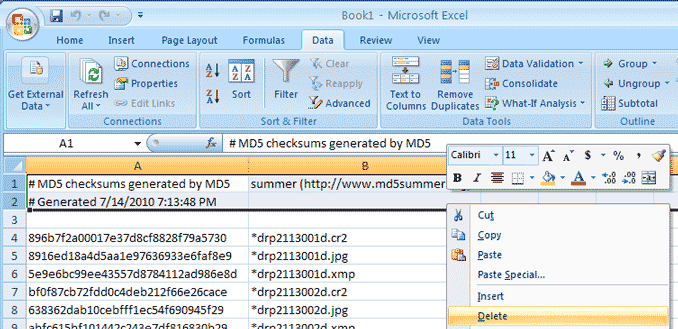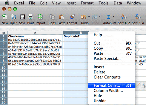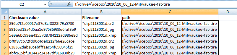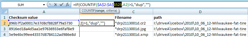 If you have not created checksum files for your folders or drives that has to be done first. If you are not familiar with that process, see the previous article, "The Trouble Transporting Tribbles: or File Verification using MD5 Checksums." At end of this article, I will share some sample data of my own to give you a rough idea of how much time this process might take. Once you have gathered together the text file(s) with those checksums and the file paths, then you can add the calculation formula to find the duplicates. Note, while the examples below use MD5 checksum values, the process will be the same if you are using other types of checksums such as SHA-1, or SHA-2. The only requirement is that all hash values be of the same type. In other words if you put both MD5 and SHA-1 checksum values into a spreadsheet to evaluate, the process can't locate duplicates.