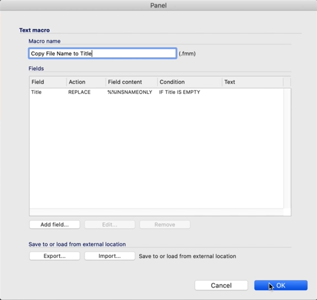 First, verify that the "Title" field is empty, unless you wish to create a macro that will replace an existing value in the IPTC Title field.