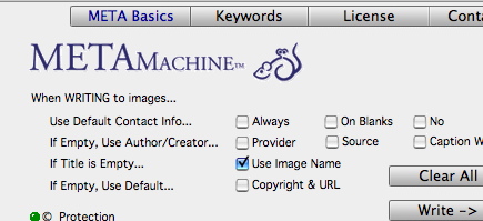 Both StockView and METAmachine have a radio button: If Title is Empty... Use Image Name. This option adds only the base filename, not the image extension, such as .jpg, or .tif. .