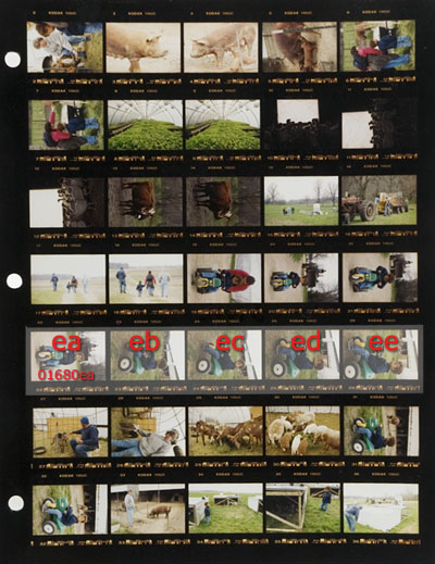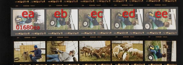 Usually when photographers refer to contact sheets we will use frame numbers, but in order to avoid "a" frames (where the image falls halfway between two numbers), I opted, instead, to use letters. The first letter represents the row, and the second the position within that row. So the first frame of the first row could be written as "aa" and the fifth frame of the 4th row would be "de." The added advantage is that mixing the letters and numbers makes the filename a little easier to remember than a string of seven numbers.
