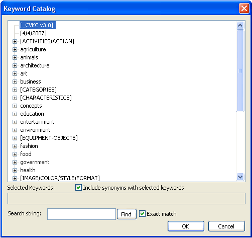 The Controlled Vocabulary Keyword Catalog or CVKC, can be imported into version 1.5 or later of the BreezeBrowser image browser using a Text file formatted specifically for BreezeBrowser Pro and saved with a unicode encoding. When installed, the the BreezeBrowser Keyword Catalog dialogue will look like the image shown below. The full version 3.x of the CVKC contains approximately 11,000 terms organized in a hierarchical structure. For detailed information on how to install the CVKC see the BreezeBrowser support page. The CVKC-FAQ (Frequently Asked Questions) page covers other specific questions. A few of the more than 30 top level hierarchies can be seen in this screen capture.